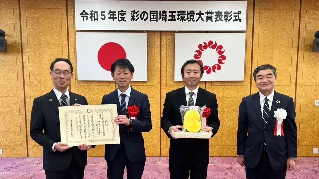 株式会社トッパンフォトマスク朝霞工場(埼玉県新座市)は、「令和5年度 彩の国埼玉環境大賞」において優秀賞を受賞しました。2024年2月8日に埼玉県知事公館で行われた表彰式で、朝霞工場長 貞廣 和昭と同工場技術開発本部環境・付帯チーム 鈴木俊宏が、埼玉県知事 大野 元裕氏、株式会社テレビ埼玉代表取締役社長 川原 泰博氏より表彰状と記念品を授与されました。