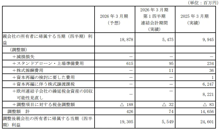 調整後親会社の所有者に帰属する当期(四半期)利益 = 親会社の所有者に帰属する当期(四半期)利益(IFRS)+ 減損損失 + スタンドアローン・上場準備費用 + 株式報酬費用 + 資本再編の検討に要した費用 + 資本再編に伴う株式譲渡課税 + 欧州連結子会社の繰延税金資産の回収可能性見直し + 調整項目に対する税金調整額