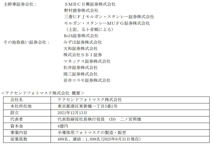 テクセンドフォトマスク株式会社(本社:東京都港区、代表取締役社長:二ノ宮 照雄、以下「当社」)は、本日、株式会社東京証券取引所(以下「東京証券取引所」)より、当社株式の東京証券取引所プライム市場への新規上場を承認されましたことをお知らせいたします。なお、東京証券取引所プライム市場への上場日は2025年10月16日(木)を予定しており、同日以降は同取引所において、当社株式の売買が可能となります。