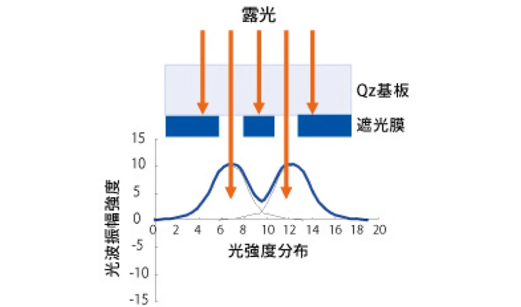 バイナリーマスクとは単純な遮光膜のパターンのみで形成されるマスクです。単純に光を透過する/遮断するという機能のみのマスクで、主として露光波長以上の太さのパターン形成に用いられます。