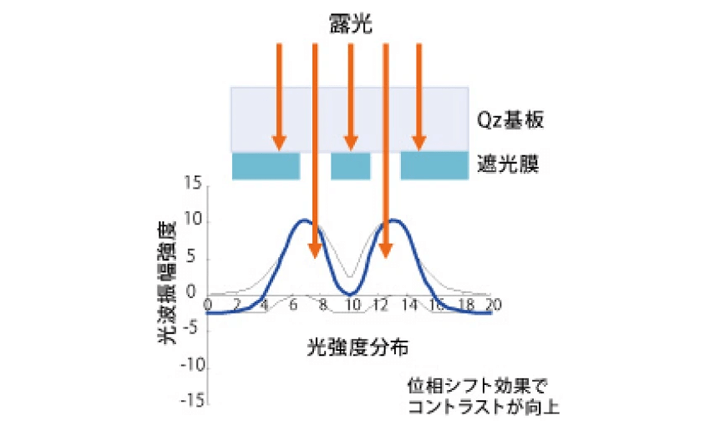 位相シフトマスク(Phase-Shifting Mask:PSM)とは、光の位相や透過率を制御する事で、ウエハーへの露光時の解像度や焦点深度(DOF:Depth of Focus)を改善し、転写特性を向上させたフォトマスクです。露光波長以下のリソグラフィーでは標準的に使用されている技術です。